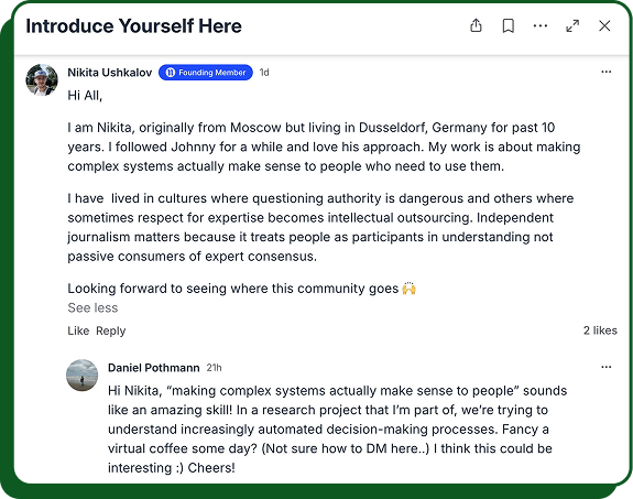 No. Lurking is a core part of the ecosystem here. Many of you said you’re joining to quietly observe how this creator-led, community-driven journalism thing actually works, or to get the exclusive content. Totally fine.